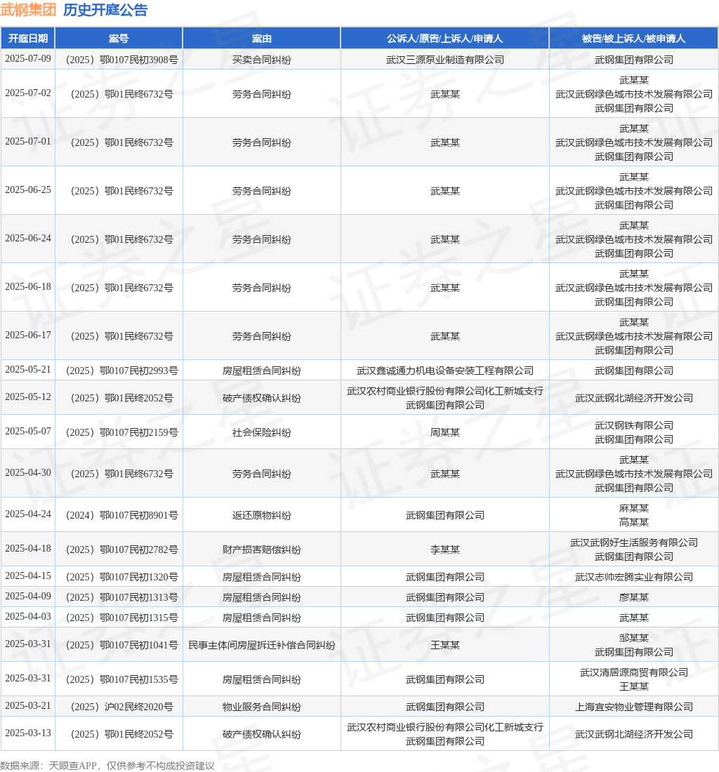 案号:(2025)鄂01民终6732号审理法院:湖北省武汉市中级人民法院案由:劳务合同纠纷当事人信息: 原告/上诉人:武某某 被告/被上诉人:武某某、武汉武钢绿色城市技术发展有限公司、武钢集团有限公司开庭日期:2025年6月17日根据统计,近一年内以武钢集团有限公司为当事人的历史开庭公告有71则,其中案由为“房屋租赁合同纠纷”的公告以19则居首,其次为“劳务合同纠纷”有15则,“物业服务合同纠纷”有7则。历史开庭公告(前20条)如下: